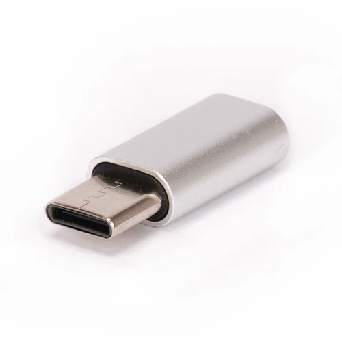 Adaptador para conexiópn de celulares dual Micro USB / i-phone / Tipo C, con cuerpo plateado.
