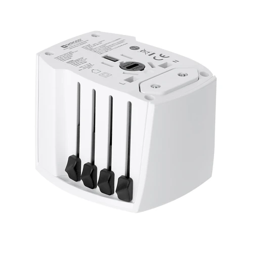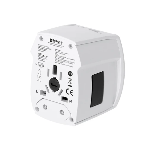 Completo adaptador de viaje universal marca SKROSS de diseño compacto y portable. Con salidas USB y Tipo C, especialmente indicado para viajes y con adaptadores multi región