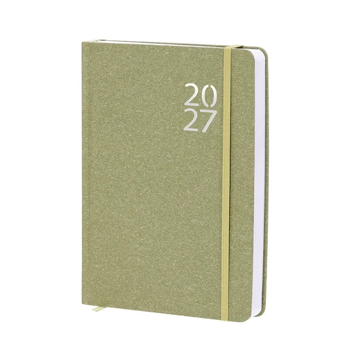 Agenda de tamaño A5 en Cartón Reciclado. Con cubiertas rígidas y elástico de cierre a juego. Incluye caja kraft de presentación. Con distintitivo ECO.Diseño página día, zona de anotaciones y marcapáginas de tela. En 2 idiomas: castellano e inglés. El Cartón Reciclado proviene del reaprovechamiento de excedente de fabricaciones y reciclaje de papel en el final de su vida útil, convirtiéndose en un lienzo ecológico y sostenible.