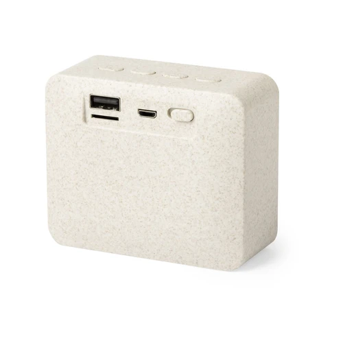 Altavoz de línea nature y conexión Bluetooth 5.0. Con carcasa en caña de trigo, para así fomentar la utilización de materias primas naturales y reducir las emisiones contaminantes. Ofrece 3W de potencia, con reproductor USB, Compatible con iOS y Android, incluye cable de carga micro USB y viene presentado en una caja individual de diseño eco. Con soportes de goma antideslizantes en la base.