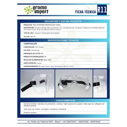 Antiparra de seguridad y protección viral, anti-salpicaduras, anti-gotas, entrega una completa protección en el sector ocular, al ser cerradas por todo el contorno. Viene con ranuras laterales y plástico PET Crystal de alta nitidez, con sistema anti-empañamiento (Anti-Fog). Contiene 4 filtros redondos de protección y elástico negro grueso de sujeción. Ideal para ser utilizada con anteojos ópticos. Ideal para uso médico, quirúrgico, transporte e industrial.