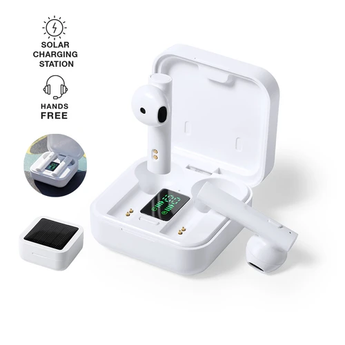 Auriculares intraurales en elegante acabado blanco y conexión Bluetooth 5.0. Con panel de carga solar integrado en la tapa y pantalla LCD interior con indicador de estado de carga. De diseño ergonómico, incluyen botón de control integrado en el auricular, con base a juego. Función manos libres y recargables con energía solar o mediante cable micro USB -incluido-. Presentados en estuche individual premium con apertura de bisagra y en atractiva caja de diseño, con manual de instrucciones en español e inglés.