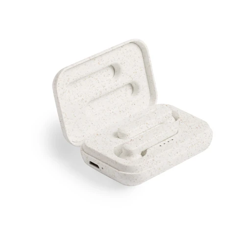 Auriculares intraurales de línea nature. Conexión Bluetooth 5.0 y carcasa en caña de trigo, para así fomentar la utilización de materias primas naturales y reducir las emisiones contaminantes. De diseño ergonómico, incluyen botón de control táctil integrado en el auricular, con base de carga a juego y luz LED de estado de carga. Función manos libres y recargables, con cable micro USB incluido. Presentados en estuche individual de lujo con tapa de bisagra y en atractiva caja de diseño eco.