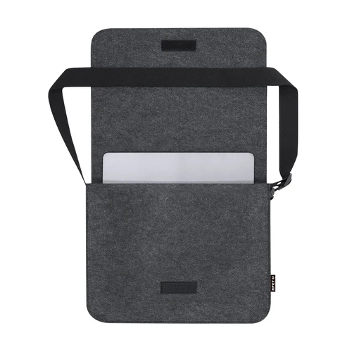 Bandolera confeccionada en Fieltro RPET con diseño urbano. Accesorio para ajuste en bandolera, con compartimento interior para ordenador portátil y documentos. Bolsillo con cierre en velcro. Distintivo RPET en etiqueta.El fieltro RPET es fruto de la combinación del proceso de reciclaje de materiales plásticos junto con la técnica milenaria de fabricación del fieltro, dando como resultado un material de eco-tendencia que, además de ser de origen reciclado, también se convierte en reciclable.