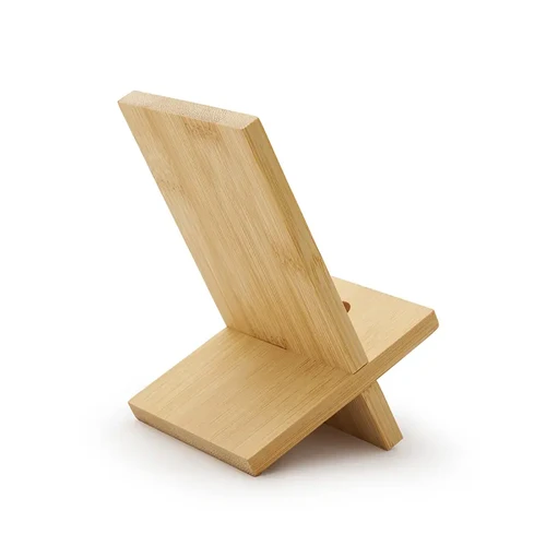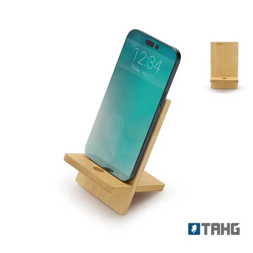 Soporte para teléfono fabricado en bambú. Incluye un orificio que permite el paso del cable facilitando la carga del dispositivo mientras está en uso.