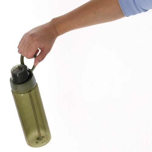 Bidón de 750ml de capacidad, fabricado en resistente RPET y en acabado translúcido. Con doble sistema de bebida, pajita y orificio de bebida. Tapa de cierre push y asa plegable. Libre de BPA.