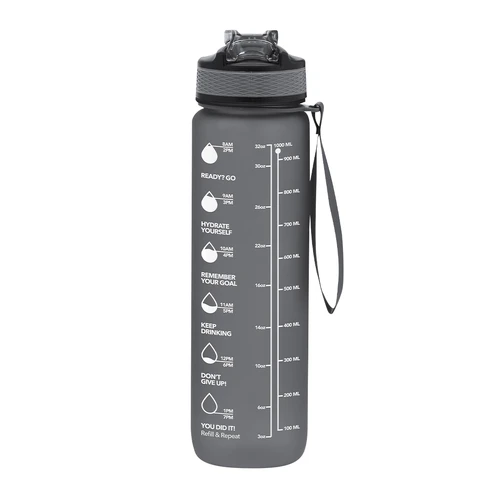 Bidón de 1L de capacidad, fabricado en resistente PETG y en acabado translúcido mate.Con indicador de capacidad en litros y onzas, junto con frases motivadoras que invitan a mantener una adecuada hidratación. Con tapón negro de rosca. Incluye dosificador con cierre de seguridad y cómoda cinta de transporte. Libre de BPA.