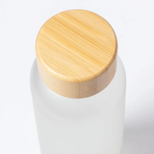 Bidón de línea nature y 500 ml de capacidad, fabricado especialmente para marcaje en sublimación. Cuerpo fabricado en cristal, con tapón a rosca de bambú y libre de BPA. Presentado en caja individual de diseño eco.