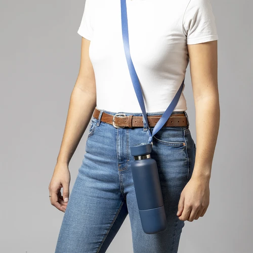 Original bidón térmico fabricado en acero inox de 550 ml de capacidad. Su tapón de rosca asegura un sellado perfecto, incorporando un compartimento con dos cuerdas intercambiables: una elegante pulsera y un versátil lanyard con aro mosquetón para facilitar el transporte. La base alberga un vaso de 300 ml con acoplamiento de rosca del mismo color, fabricado en resistente PP. Disponible en variados colores mate. Presentado en caja individual diseño kraft.