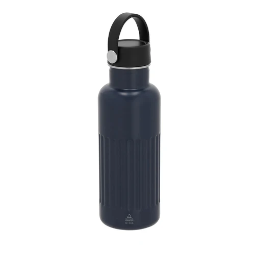 Bidón térmico en Acero Inox Reciclado de doble pared y 500 ml de capacidad. Exterior en acabado biselado mate. Incluye tapón a rosca con asa fabricada en flexible PP. Incluye distintivo de Acero Inox Reciclado.El acero es uno de los materiales más demandados y que puede encontrarse casi en todas partes, desde productos de uso diario a grandes construcciones. Con innumerables propiedades, entre las que cabe destacar la durabilidad y su alto grado de reutilización, convirtiéndolo en una alternativa muy valorada en soluciones de sostenibilidad. Debidamente tratado, permite obtener nuevos recursos de infinita utilización.