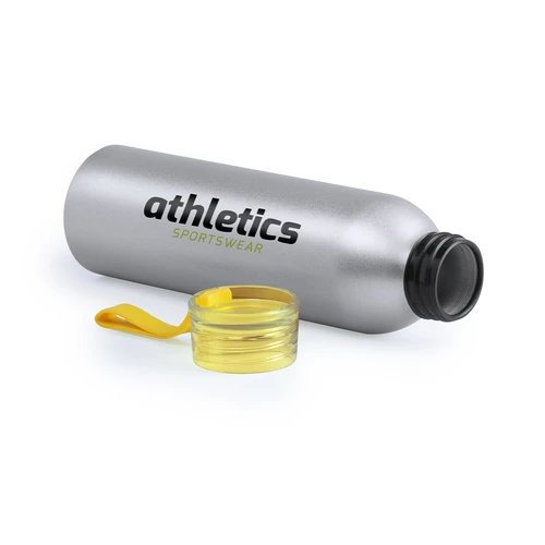 Bidón de aluminio de 650 ml de capacidad. Cuerpo en color plateado, con tapón de seguridad a rosca en variada gama de colores transparentes. Cinta de transporte en material TPR a juego.