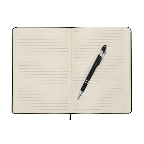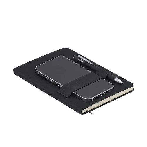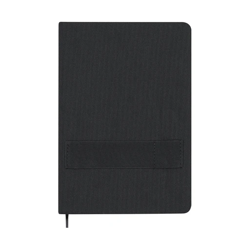 Bloc de notas en tamaño A5 fabricado en elegante RPET. Portadas rígidas en acabado tela. Incluye banda elástica en la tapa, ideal para sujetar móvil y portabolígrafos elástico. Interior con 80 páginas a disposición de una raya, marcapáginas de cinta en combinación y sobre en las contraportadas. Incluye bolígrafo con tinta azul, cuerpo de aluminio acabado goma, clip metálico y tiene acción por pulsador en combinación. Presenta distintivo logotipo RPET.