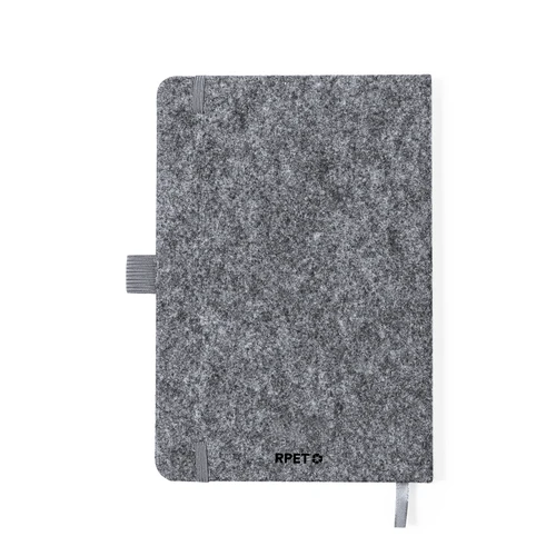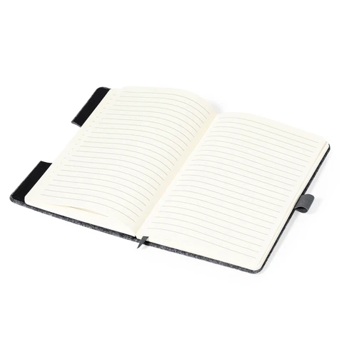 Bloc de notas con soporte de tapas rígidas fabricado en fieltro RPET 300D. Con original soporte para smartphone y tablet integrado en la portada, fabricado en bambú. Incluye elástico de cierre y soporte para bolígrafo a juego, con 80 hojas interiores de disposición a una raya. Con logotipo RPET en contraportada y presentada en bolsa individual reciclada.El fieltro RPET es fruto de la combinación del proceso de reciclaje de materiales plásticos junto con la técnica milenaria de fabricación del fieltro, dando como resultado un material de eco-tendencia que, además de ser de origen reciclado, también se convierte en reciclable.
