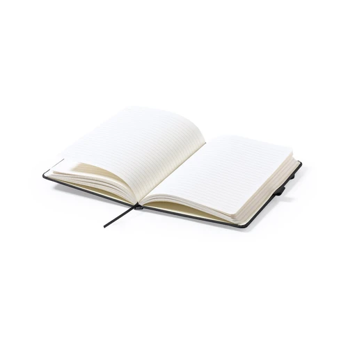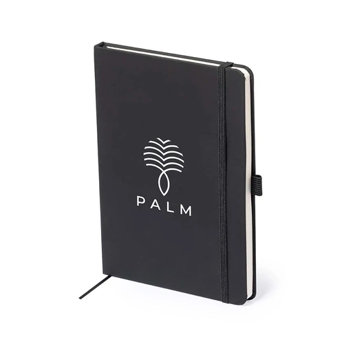 Bloc de notas fabricado en polipiel de elegante acabado en negro. Con tapas duras, marcapáginas y elástico de sujeción a juego. Interior con 100 hojas de disposición a 1 raya y soporte para bolígrafo (bolígrafo no incluido).