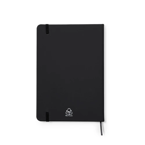 Bloc de notas con tapas rígidas fabricadas en polipiel reciclada en distintos colores. Interior con 100 hojas de disposición a una raya. Incluye elástico de cierre del mismo color. Con distintivo Polipiel Reciclada. Presentado en bolsa individual reciclada.La polipiel destaca por su resistencia y elasticidad. Este material reciclado y reciclable es una opción sostenible que rescata las fibras desechadas en los procesos de fabricación, minimizando así el desperdicio de material y contribuyendo a su vez a reducir el impacto ambiental, manteniendo a la vez sus propiedades originales.