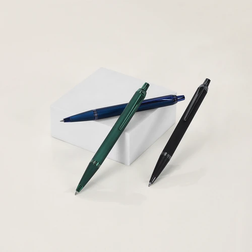 Bolígrafo con cuerpo en aluminio, acabado gomoso y detalles cromados. De mecanismo pulsador, con cartucho jumbo y tinta azul.