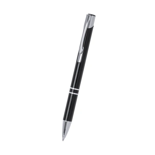 Bolígrafo de mecanismo pulsador fabricado en aluminio. Incluye accesorios plateados y clip, pulsador y punta a juego.En tinta negra.