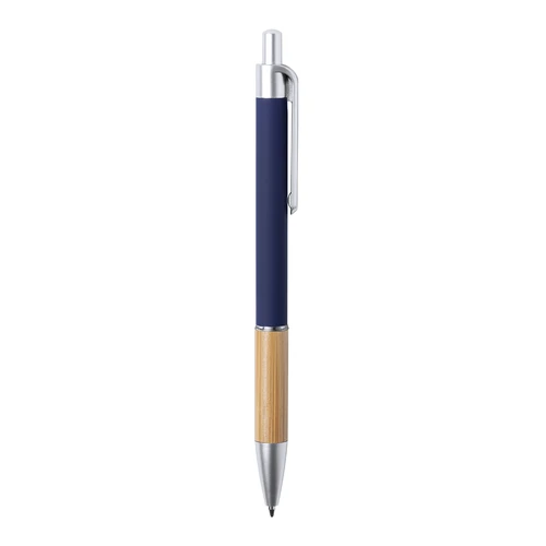 Bolígrafo de línea nature y mecanismo pulsador. De elegante diseño, con cuerpo en aluminio de acabado mate y empuñadura en bambú, con accesorios en acabado mate. Clip de acabado metalizado y anilla transparente, en tinta azul. Disponible en variada gama de colores.