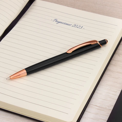 Metal. Cuerpo de aluminio, acabado engomado color negro, muy suave al tacto. Bolígrafo retráctil. Clip, puntera y detalles metálicos color cobre. Decapa color cobre (grabado exclusivo en nuestro taller). Tinta Negra.