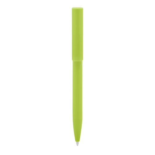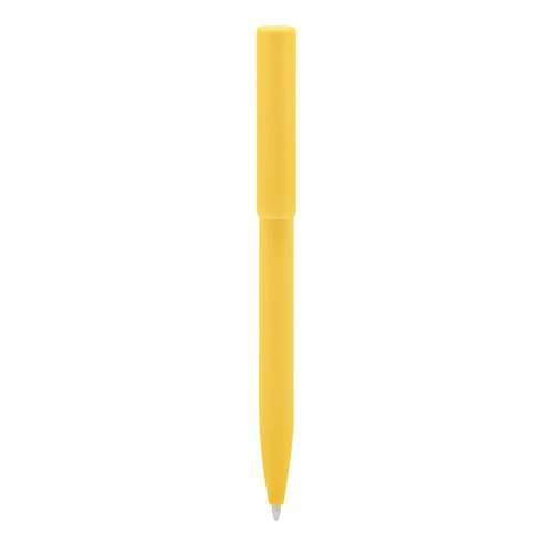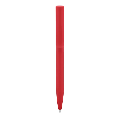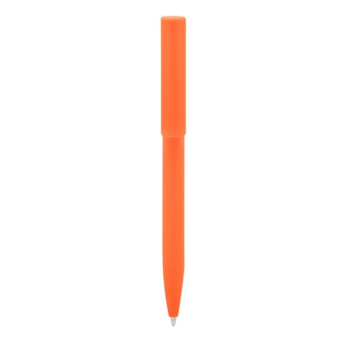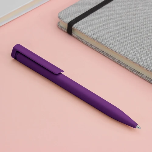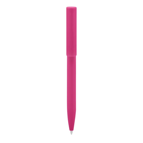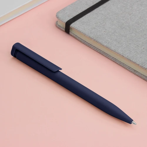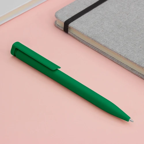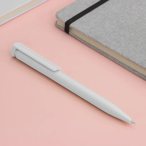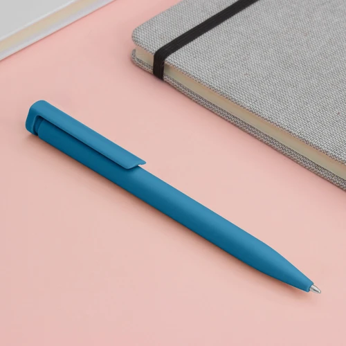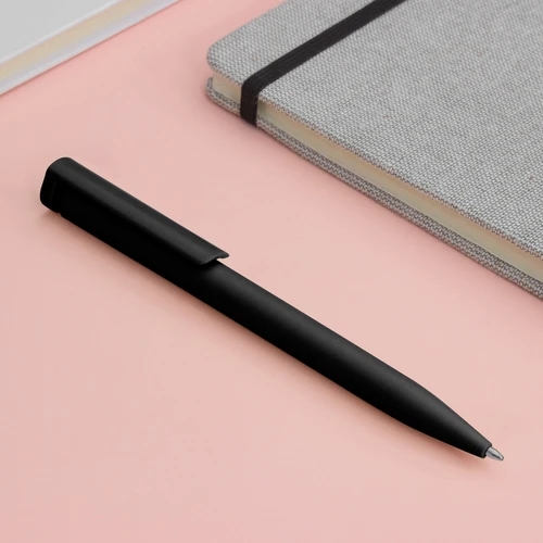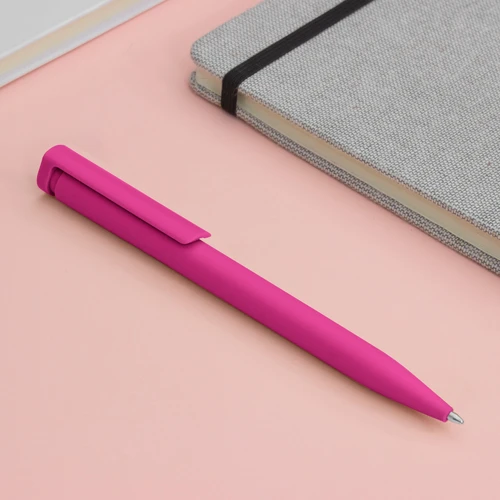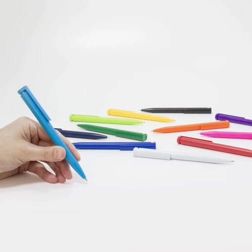 Plástico. Cuerpo de diferentes colores. Bolígrafo retráctil. Clip plástico del mismo color del cuerpo. Tinta negra. Sistema de botón push para destapar. Amplia área de impresión.