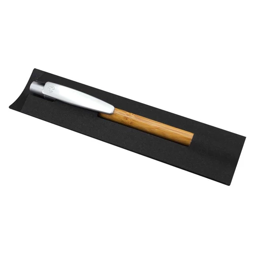 Bolígrafo de madera de Bamboo, con terminales satinados. Refill plástico parker type. Escritura azul. Presentación individual en Estuche de Cartón reciclado.