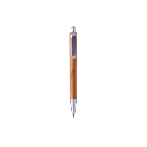Bolígrafo cuerpo de bambú. Pulsador y puntera plásticos color plata. Clip metálico. Tinta azul.
