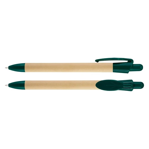 Bolígrafo Ecológico "Leave" con cuerpo de cartón reciclado y clip plástico PET biodegradable con forma de hoja. Escritura azul.