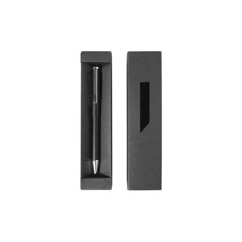 Acero inoxidable. Boligrafo rollerball. Cuerpo laqueado negro mate. Clip y puntera color plata. Tinta negra. Presentación en caja de regalo.