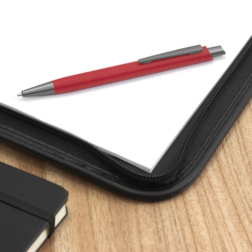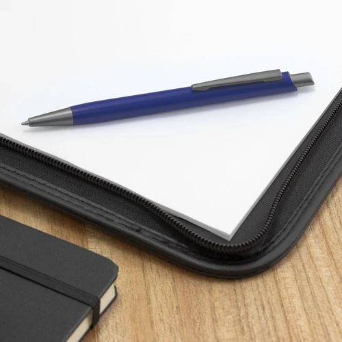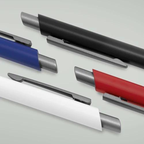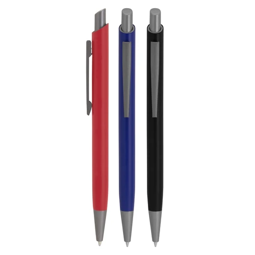 Aluminio, ABS, Acero. Boligrafo retráctil. Cuerpo revestido en laca de diferentes colores. Acabado mate. Pulsador, clip y puntera de color gris gun metal. Tinta azul. Amplia área de impresión.