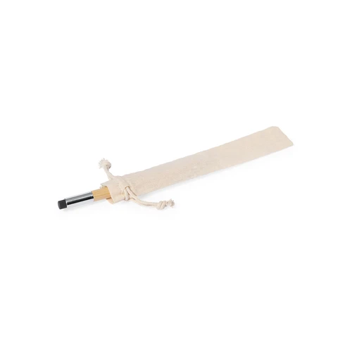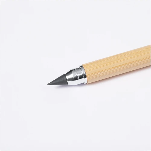 Bolígrafo lápiz eterno 2 en 1, fabricado en bambú, con cuerpo de suave acabado y accesorios cromados. Con cierre de capucha con borrador y puntero en cada extremo, incluye bolígrafo en un extremo (carga jumbo y tinta azul), y lápiz eterno en el otro extremo, para así usar siempre el mismo lápiz y no generar residuos. Presentado en funda de algodón 100%, con cordón de cierre.