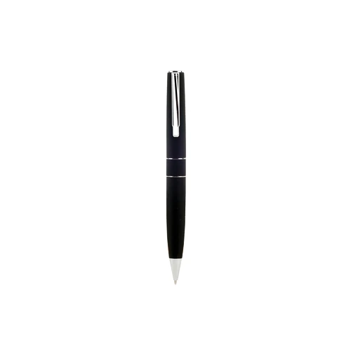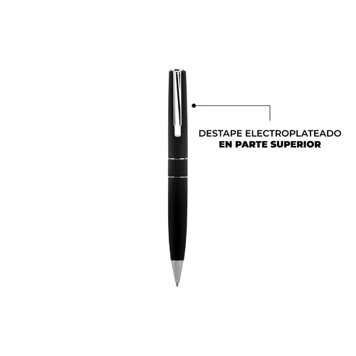 Metal. Cuerpo metálico engomado. Clip y detalles color plata. Tinta negra. Estuche con cierre magnético. Área de impresión: Ø 0,8 x 5 cm. Destape electroplateado en la parte superior. Presentación en estuche con cierre magnético.
