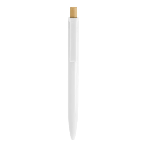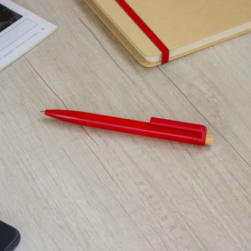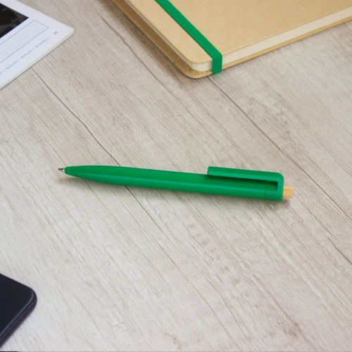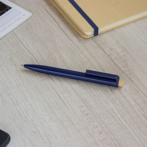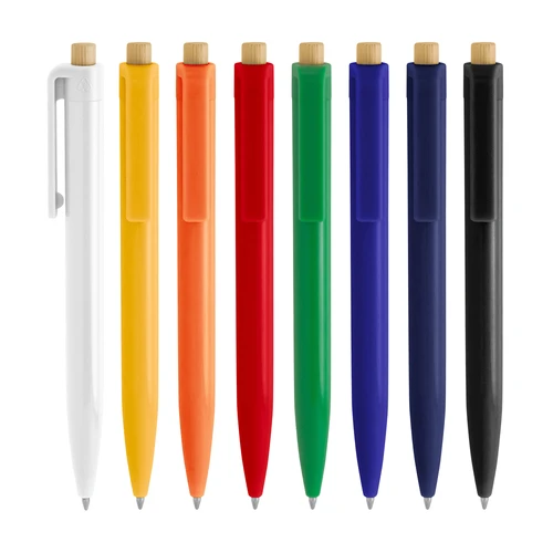 Diseño moderno con materiales reciclados.Bolígrafo retráctil. Cuerpo plástico en diferentes colores acabado brillante. Pulsador de bambú. Medidas: 1,05 x 13,5 cm.