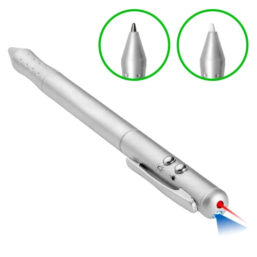 Bolígrafo metálico multi-función 4 en 1. Incluye bolígrafo, linterna LED, puntero láser y puntero PDA (Palm). Presentación en estuche de aluminio. Escritura Azul.