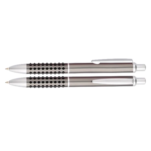 Bolígrafo metálico satinado modelo "Caterpillar", con lunares de goma negra que brindan una suave sensación de masaje dactilar al escribir. Escritura azul.