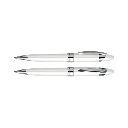 Bolígrafo metálico modelo "White Pearl", con terminales cromados plata. Escritura azul.