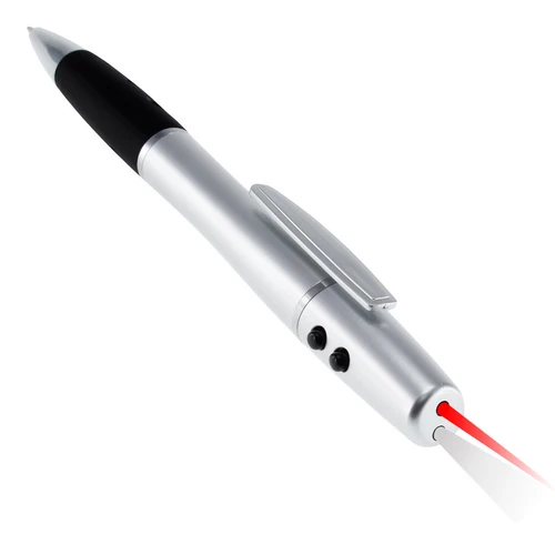 Bolígrafo plástico multi-función 3 en 1. Incluye bolígrafo, linterna LED y puntero láser. Escritura negra. Presentación en estuche metálico y caja plateada de cartón.