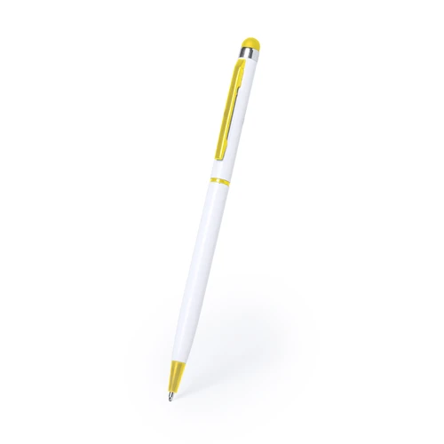 Bolígrafo puntero de mecanismo giratorio con cuerpo en aluminio de color blanco y accesorios en variada gama de vivos colores. Con clip troquelado y tinta azul.