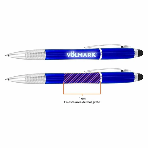 NOTA IMPORTANTE: Consulte y revise la ubicación de grabado láser del logo, ya que la luz LED ilumina una única posición dentro del bolígrafo. La longitud de iluminación LED es de 4 cm, exactamente sobre la posición indicada.