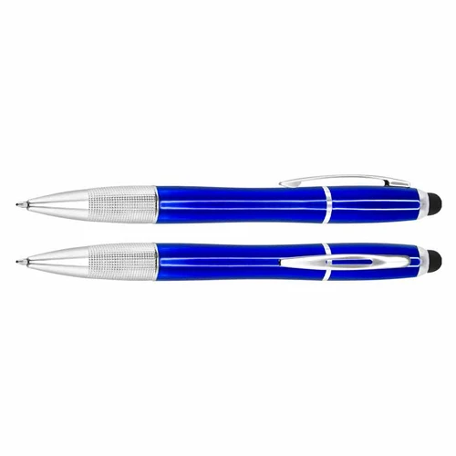 Bolígrafo plástico con puntero screen-touch al tono, modelo "NEON". Incluye luz LED al interior, para retroiluminar logo grabado sobre el cuerpo del bolígrafo. Escritura azul.