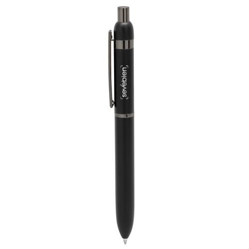 Metal. Cuerpo de aluminio. Bolígrafo retráctil. Clip, botón y anillos metálicos color plata. Tinta Negra. Destape electroplateado en ambas partes. Presentación en estuche con cierre magnético.