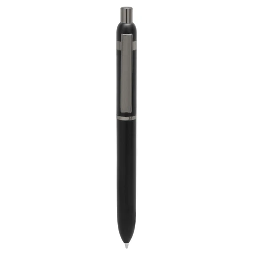 Metal. Cuerpo de aluminio. Bolígrafo retráctil. Clip, botón y anillos metálicos color plata. Tinta Azul. Destape electroplateado en ambas partes.. Presentación en estuche con cierre magnético.