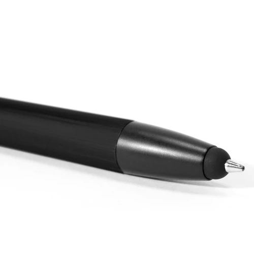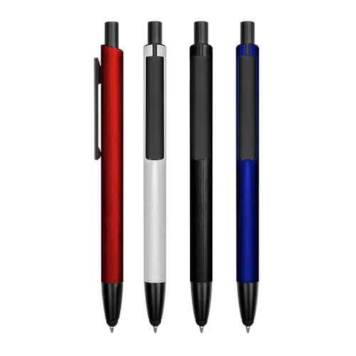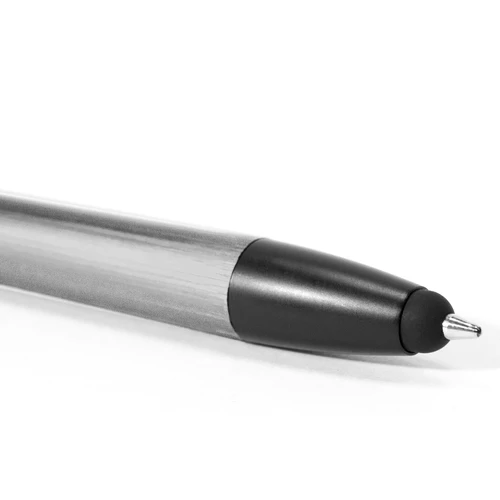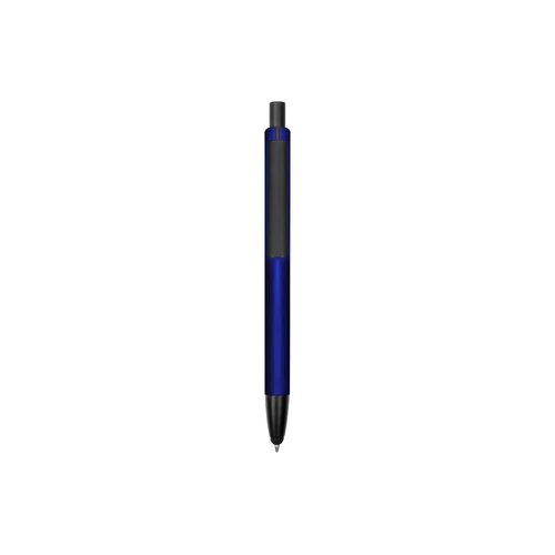 Aluminio. Cuerpo metálico. Clip, punta y pulsador plásticos. Punta touch. Tinta azul.