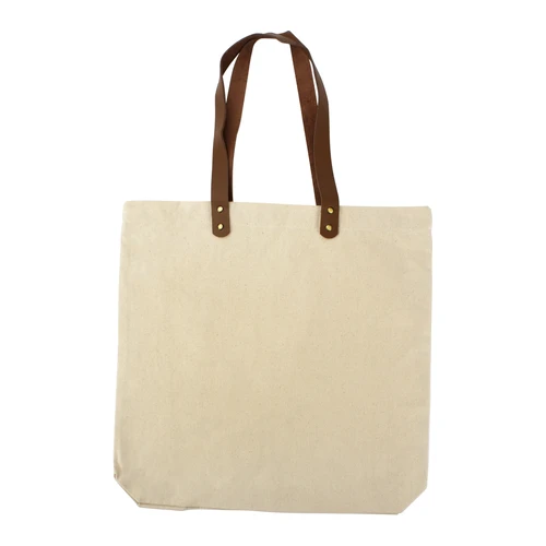 Bolsa de Compras con asas de cuero, en tela Canvas Algodón laminado natural de 10oz. (280 g/m2). Contiene doble manilla de Cuero natural, 8 remaches color bronce envejecuido y cierre interior imantado.