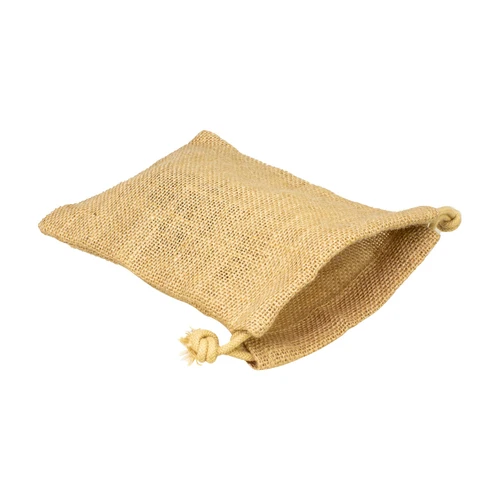 Bolsa de Yute tipo saco de 14 x 19 cm, sin recubrimiento laminado interior. Cuenta con asa-cordón retraíble de yute, en la parte superior de la bolsa.