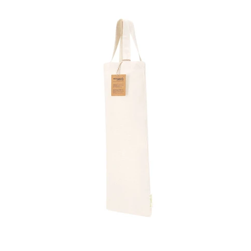 Bolsa confeccionada principalmente en algodón reciclado de 140 g/m2, de diseño alargado. Asas cortas de 30cm con refuerzo, de acabado cosido. Logotipo en etiqueta lateral.