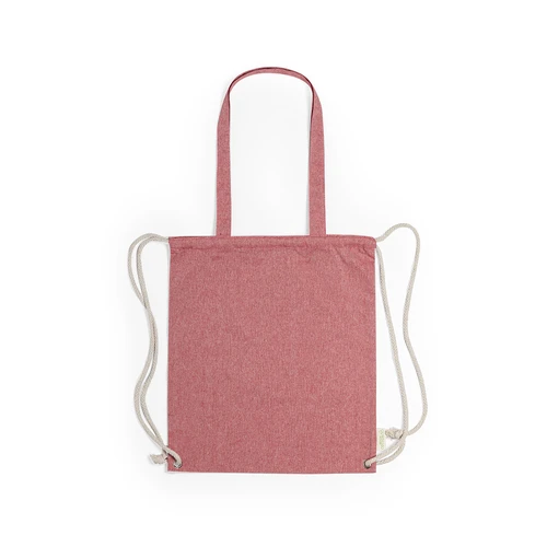 Bolsa mochila de cuerdas de línea nature, en resistente algodón reciclado de 140g/m2, con asas de transporte de 70 cm a juego. Cuerdas en algodón de color crudo, con argollas metálicas reforzadas y distintivo algodón reciclado en etiqueta. Disponible en variada gama de colores. Resistencia hasta 9kg de peso.