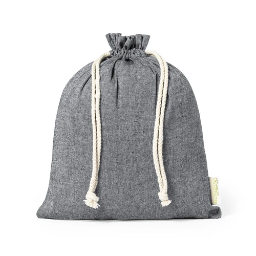 Bolsa eco-friendly en resistente material 100% algodón reciclado GRS de 120g/m2. Certificación GRS (Global Recycled Standard / Estándar de Reciclaje Global), que garantiza el origen reciclado del material usado para fabricar el producto. Cierre de cordón de algodón y acabado cosido, incluye etiqueta exterior con distintivo algodón reciclado.