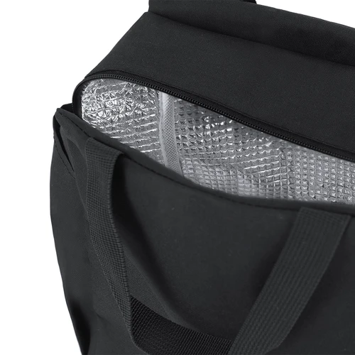 Bolsa nevera isotérmica confeccionada en poliéster RPET 600D. Compartimento principal acolchado con cierre de cremallera con tirador metálico. En los laterales cuenta con bolsillos abiertos, y asar para fácil transporte en la parte superior.