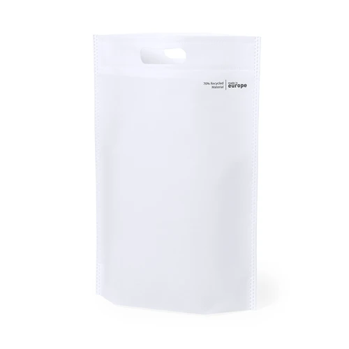 Bolsa de línea nature, fabricada en non-woven reciclado de 70g/m2. De fabricación europea, con acabado termosellado, fuelle en la base, asa reforzada troquelada y distintivo eco/made in sobre la bolsa.