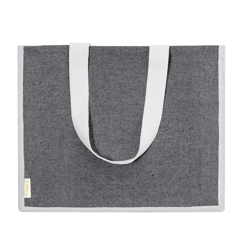Bolsa en material 100% algodón reciclado de 140 g/m2 en combinación con el yute. Asas largas de 70cm con refuerzo, de acabado cosido y fuelle de yute. Logotipo en etiqueta lateral y resistencia hasta 8 kg de peso. Disponible en variada gama de colores nature con base de color natural.